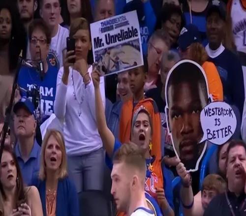 这是杜兰特出走后,首次回到雷霆主场,球迷用嘘声和各种嘲讽的招牌欢迎这位昔日的球队当家球星。