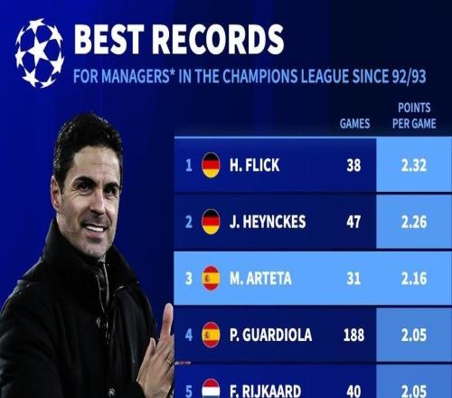 执教欧冠25+场主帅中,塔帅场均积分仅次于弗里克和海因克斯