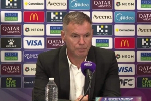 女足主教练米利西奇携陈巧珠出席亚洲杯小组赛第二轮赛前发布会
