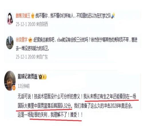 贾磊是这样说道:这场比赛,可以说分析技术已经没有任何意义,真没有想到,自己在有生之年,还能够看到中国男篮在国际比赛中落后韩国队32分!我真的是理解不了,很难受,这就是一场耻辱性的失利。