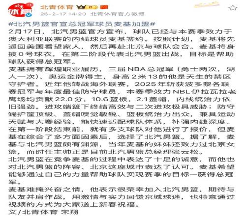 北京首钢俱乐部官宣麦基加盟,麦基第二阶段就可以上场,将穿0号球衣。京媒【北青体育】详细报道了北京首钢得到麦基的一些内幕。