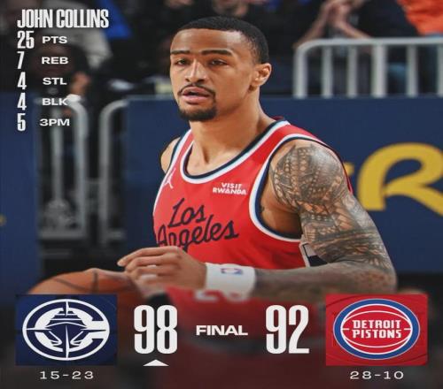 北京时间1月11日,NBA常规赛:快船客场98-92逆转活塞,本赛季双杀东部第一。快船内线科林斯表现出色,投篮14中9,三分8中5,罚球4中2,砍下25分7篮板1助攻4抢断4盖帽,正负值+19全场最高。最近11场比赛,快船9胜2负。