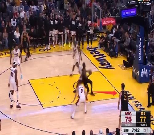 第三节还剩7分42秒,巴特勒内线接球,米切尔是绕前想要破坏这个球权,两人在空中有一个小碰撞,巴特勒落地时他的右腿有一个震荡,右膝小范围的反关节。
