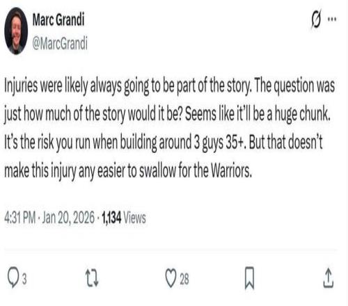 正如湾区记者Marc Grandi所说:“当你围绕三个35岁以上的球员建队时,伤病似乎注定会成为故事的一部分,这就是你必须承担的风险。”