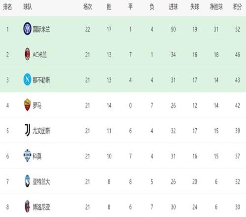 意甲最新积分战报国米逆转大胜弱旅多AC米兰6分稳居榜首