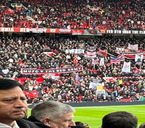 北京时间1月17日,英超第22轮焦点之战曼市德比正在进行中,半场战罢,双方的比分仍旧是0-0,现场氛围还是十分热烈,曼联球迷举“115”标语,曼城球迷则高唱阿莫林的歌曲。