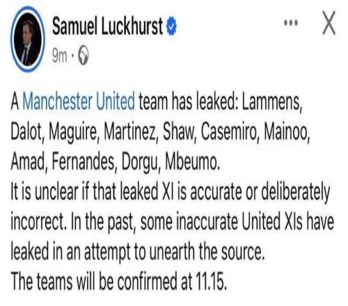 太阳报:曼市德比首发泄露,曼联已展开内部调查