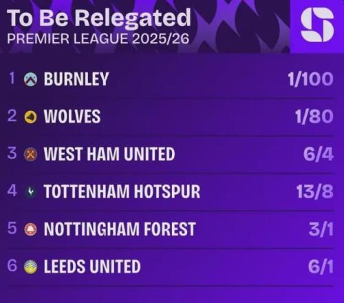 雪上加霜的是,热刺的保级处境已然岌岌可危。目前,他们的降级赔率排名英超第四,仅低于伯恩利、狼队和西汉姆,身后的诺丁汉森林、利兹联士气正盛,随时可能完成反超。更致命的是,后续赛程堪称“地狱模式”:下周要迎来欧冠16强对阵马竞的生死战,随后做客安菲尔德挑战利物浦,剩余联赛中,既有阿森纳、切尔西等争冠强队,也有森林、利兹联等保级直接对手,双线作战的压力之下,热刺的保级之路难如登天。