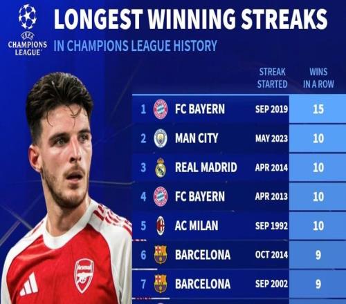 欧冠历史最长连胜TOP10:拜仁15连胜第1,阿森纳并列第10