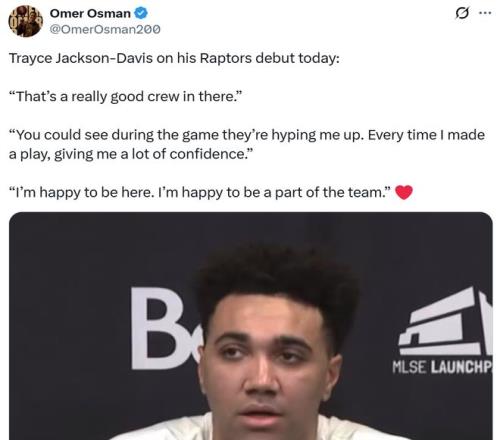 赛后TJD谈及首秀表现时坦言:“猛龙是一支非常出色的队伍,你们可以看到比赛中他们一直都在为我加油,每一次我完成快攻,他们都给我很大的信心,真的很高兴来到这里,成为团队的一员。”