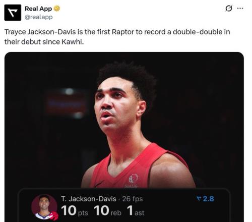 凭借这样的表现,TJD成为猛龙队史第5位加盟首秀就能拿下两双的新援,也是小卡之后首人。
