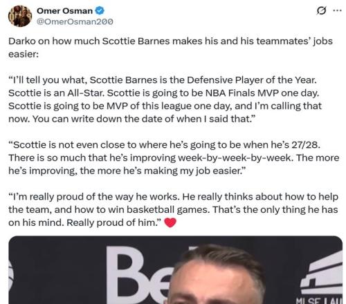 面对巴恩斯这样的表现,猛龙队主帅拉贾科维奇猛夸到:“我跟你说,巴恩斯是年度最佳防守球员,他是全明星球员,总有一天他会成为FMVP,也会成为这个联盟的MVP,你们可以记下我说这番话的日期。”