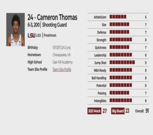 首先我还是放上托马斯当初的选秀报告做参考,看看他为何仅是27顺位秀,选秀综合评分91分,在运动能力评分为6非常低,选秀模板赛斯-库里.