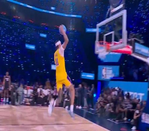首轮布莱恩特率先登场,第一扣是360度大风车,得到45.6分。理查德森随后登场,自己将球抛出,跟上接球拉杆背扣,拿到45.4分。