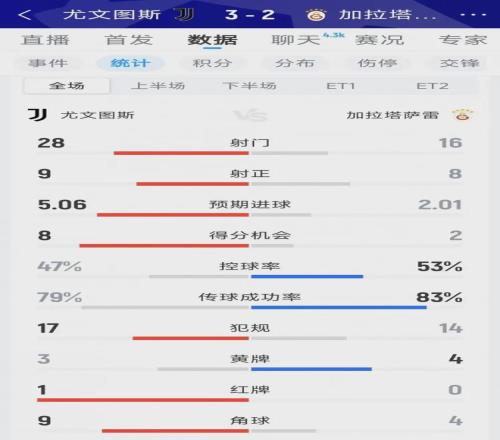 数据是最好的证明:全场28次射门、9次射正、预期进球5.06,碾压加拉塔萨雷的16射8正、预期进球2.01。洛卡特利点射打破僵局,卡卢卢助攻加蒂破门,麦肯尼头球接力建功,常规时间3-0的比分,硬生生将总比分扳为5-5,把比赛拖入加时赛——这是属于尤文的血性,是绝境中不放弃的倔强。