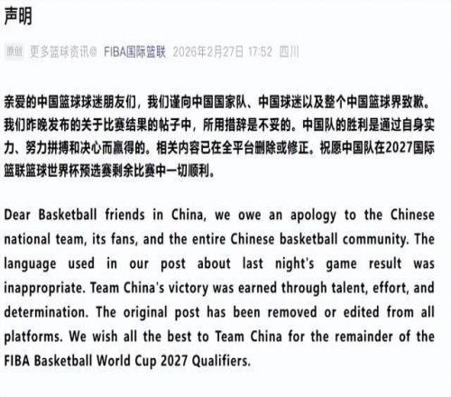 在比赛结束后的第二天,FIBA官方终于还是顶不住压力了,官方发布声明表示,因昨日中国男篮战胜日本男篮的比赛结果帖子中的措辞不当,向中国男篮、中国球迷以及整个中国篮球界致歉。FIBA国际篮联声明内容如下:亲爱的中国篮球球迷朋友们,我们谨向中国国家队、中国球迷以及整个中国篮球界致歉。我们昨晚发布的关于比赛结果的帖子中,所用措辞是不妥的。中国队的胜利是通过自身实力、努力拼搏和决心而赢得的。相关内容已在全平台删除或修正。祝愿中国队在2027国际篮联篮球世界杯预选赛剩余比赛中一切顺利。