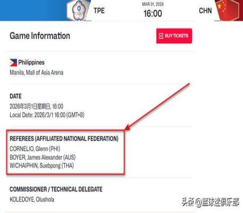FIBA的官网显示,双方比赛的裁判员以及所属篮协信息已经出炉如下图: