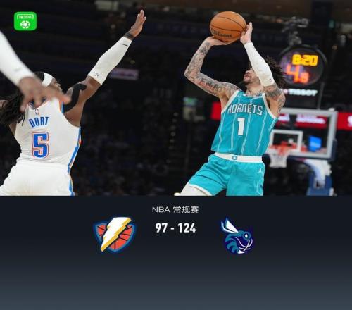 北京时间1月6日NBA 常规赛,俄克拉荷马雷霆对阵夏洛特黄蜂。半场雷霆50-67黄蜂,最终雷霆97-124黄蜂。俄克拉荷马雷霆亚历山大21分2板6助,杰伦-威廉姆斯16分2板4助;夏洛特黄蜂布兰登-米勒28分6板1助,克努佩尔23分5板5助。