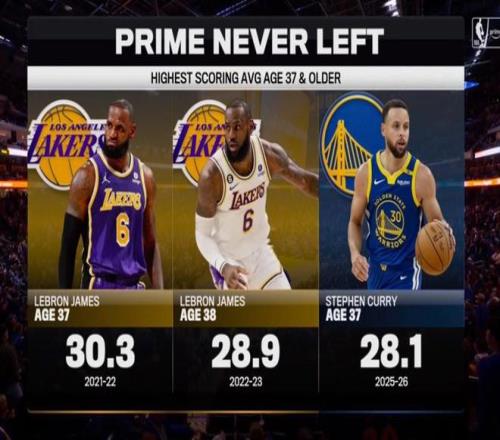 在直播期间,比赛转播方晒出了两队球星詹姆斯和库里的场均得分数据进行对比。目前37岁的库里本赛季场均得分位28.1分,作为对比,37岁的詹姆斯在2021-22赛季场均能得到30.3分,而老了一岁的他在2022-23赛季还能得到28.9分,高于库里本赛季至今的场均得分。