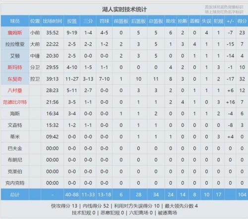 东契奇32分11板8助3断、詹姆斯23分5板6助2断4失误。祖巴茨抢了10个前场篮板,湖人全队只有6个。最后看看数据,说说你的心情: