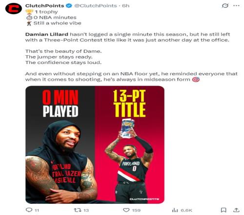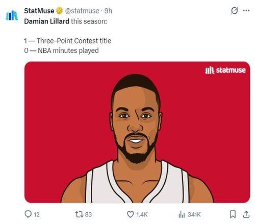 除此之外利拉德还创造了一项NBA历史首人纪录,他在本赛季还未出战过任何一分钟,却拿到了三分大赛的冠军,他是历史首位做到的NBA球员。