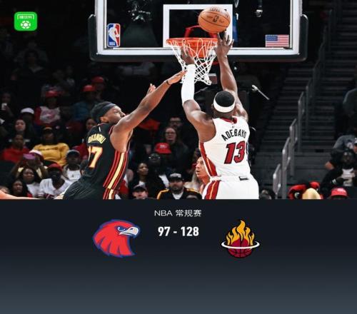北京时间2月21日NBA 常规赛,亚特兰大老鹰对阵迈阿密热火。半场老鹰51-57热火,最终老鹰97-128热火。