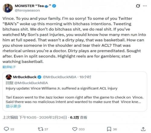 今天得知消息后,伊森的母亲也在社交媒体上向小文威道歉了,不过伊森妈妈否认“伊森的动作很脏”,他说,如果你看过我儿子过去的伤病史,就会知道有多少人全速冲撞过他。那不是脏动作,那就是篮球动作。你推一下肩膀怎么可能导致前交叉韧带撕裂?这话我就这么一说,除非你是医生。 脏动作是有预谋、刻意为之的,哪怕只是一瞬间。集锦片段是给赌球的人看的,麻烦你们好好看球吧。