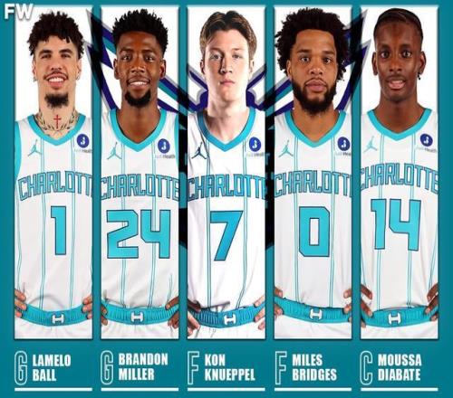 赛季初,黄蜂4胜13负开局,大家都以为他们又要俯冲抢状元了。结果等首发阵容凑齐后,风向全变了。 由三球(LaMelo Ball)、米勒、克努佩尔、桥桥(Miles Bridges)和迪亚巴特组成的首发五虎,本赛季合体出战31场,战绩是惊人的28胜3负! 这套阵容的进攻效率高达134.9。简单来说,只要这五个人在场,黄蜂就是在用激光枪打别人的冷兵器。