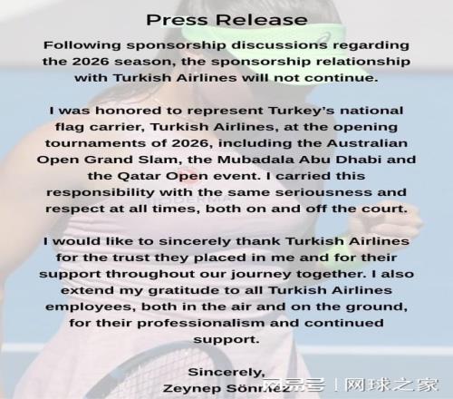 在赛场上为土耳其创造历史之后,索内兹如今选择独自前行。作为土耳其女子单打头号球员,索内兹于周五在社交媒体上发布声明,宣布结束与土耳其航空(Turkish Airlines)的合作关系。