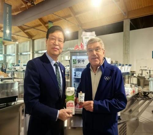国际奥委会终身名誉主席巴赫(右)与蒙牛高级执行总裁李鹏程(右)在米兰奥运村运动员食堂