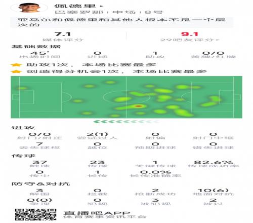 佩德里本场数据:替补送助攻,3次解围,2次抢断,1次关键传球