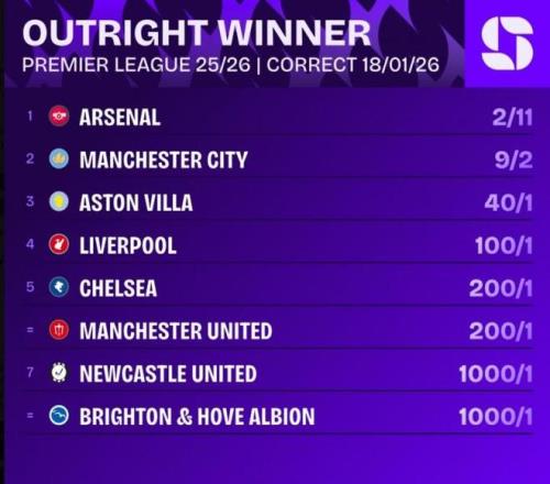 权威机构随即更新了夺冠概率,阿森纳的概率低至2/11(不低了),呈现断崖式领先,曼城则升至9/2,维拉和利物浦已分别达到40/1和100/1。这7分差距在赛季后期意味着巨大的心理和实际优势,阿森纳已被普遍视为本赛季英超冠军的最大热门。