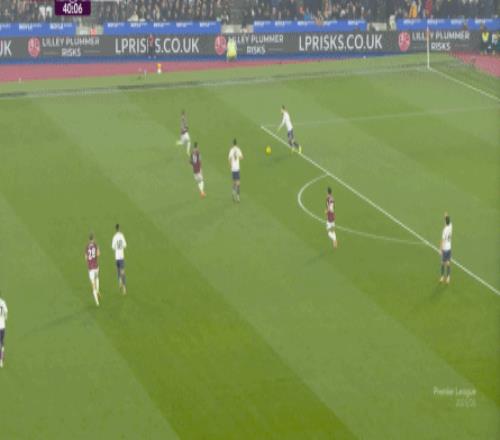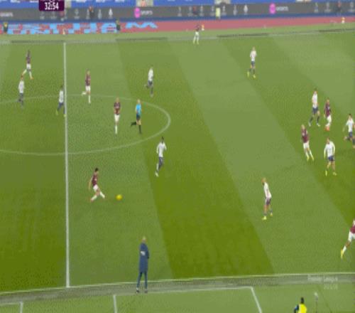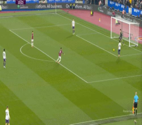 而这种身体层面带来的问题,不仅会出现在有球的时候,也会出现在无球的时候,比如这次高位逼抢,实际上只有布鲁诺一人有效参与,于是西汉姆联后卫可以先抬头观察,再低头起脚,便和鲍文一起制造了前场的定位球: