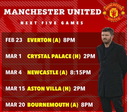 与埃弗顿的比赛后,曼联将遭遇水晶宫、纽卡斯尔、维拉和伯恩茅斯,其中与维拉的比赛可能直接关系英超季军的归属。